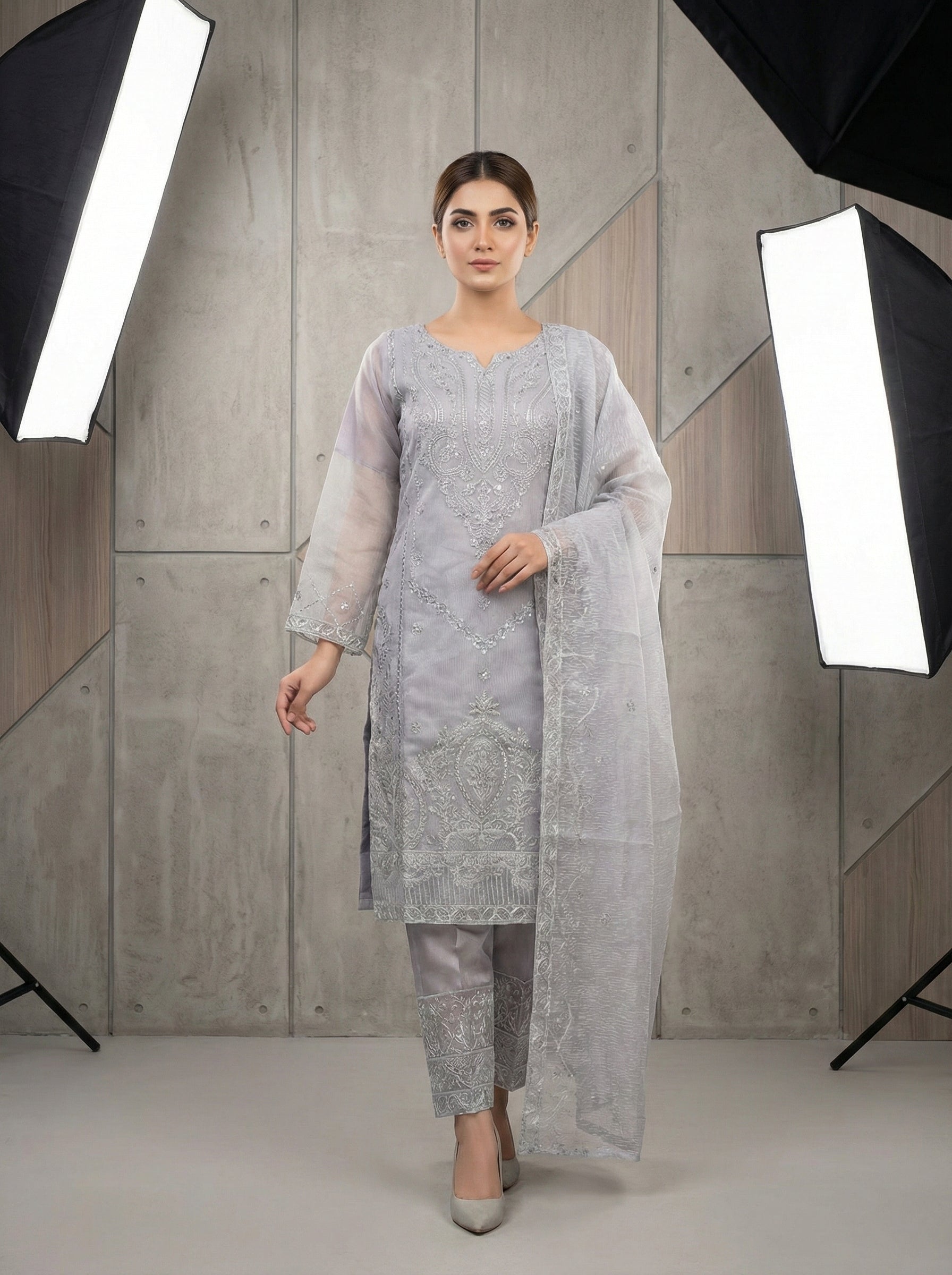 Shirt: Khaadi organza fabric with elegant embroidery and fine stone work, giving a rich and graceful look.
