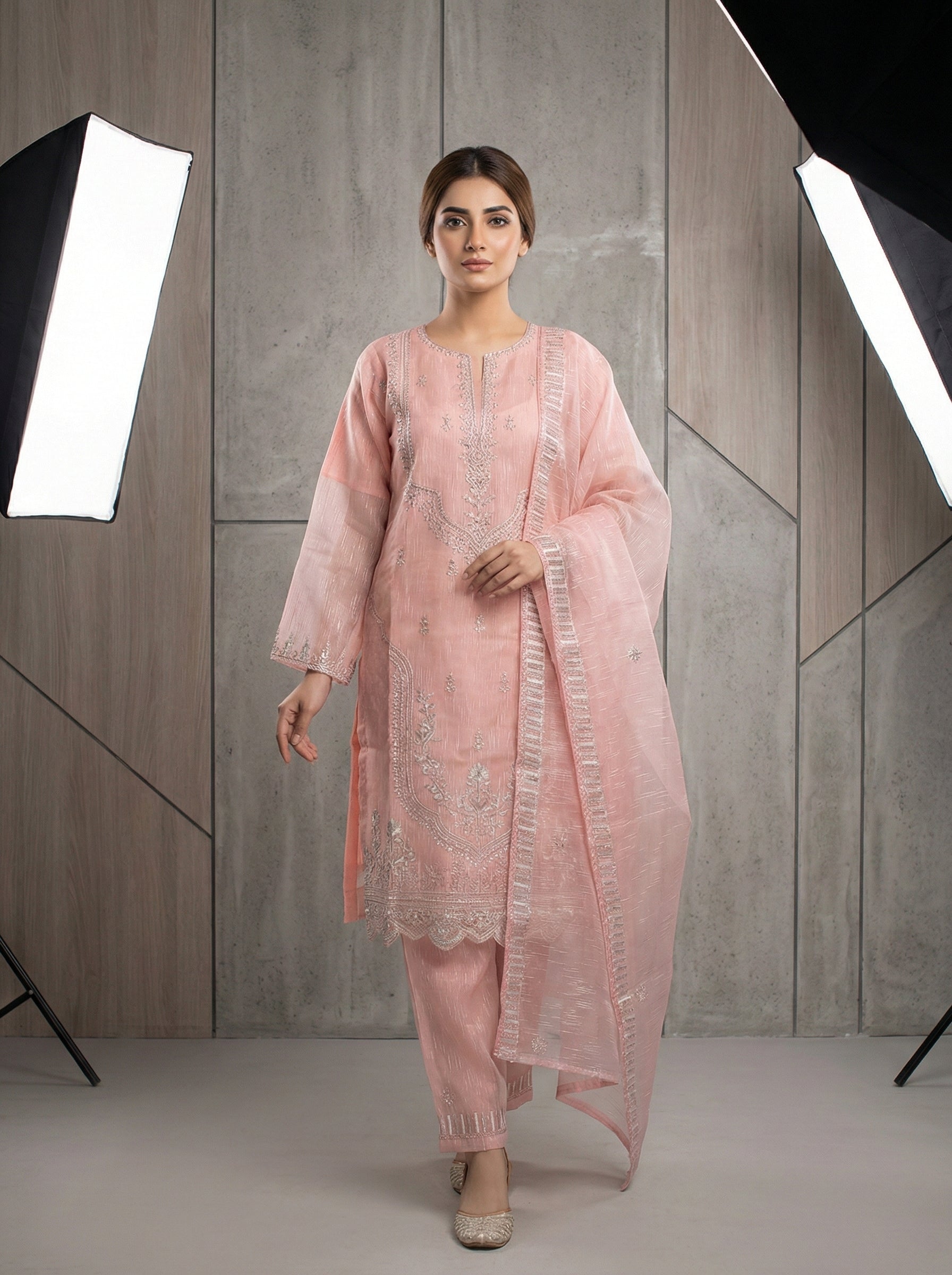 Shirt: Khaadi organza fabric with elegant embroidery and fine stone work, giving a rich and graceful look.