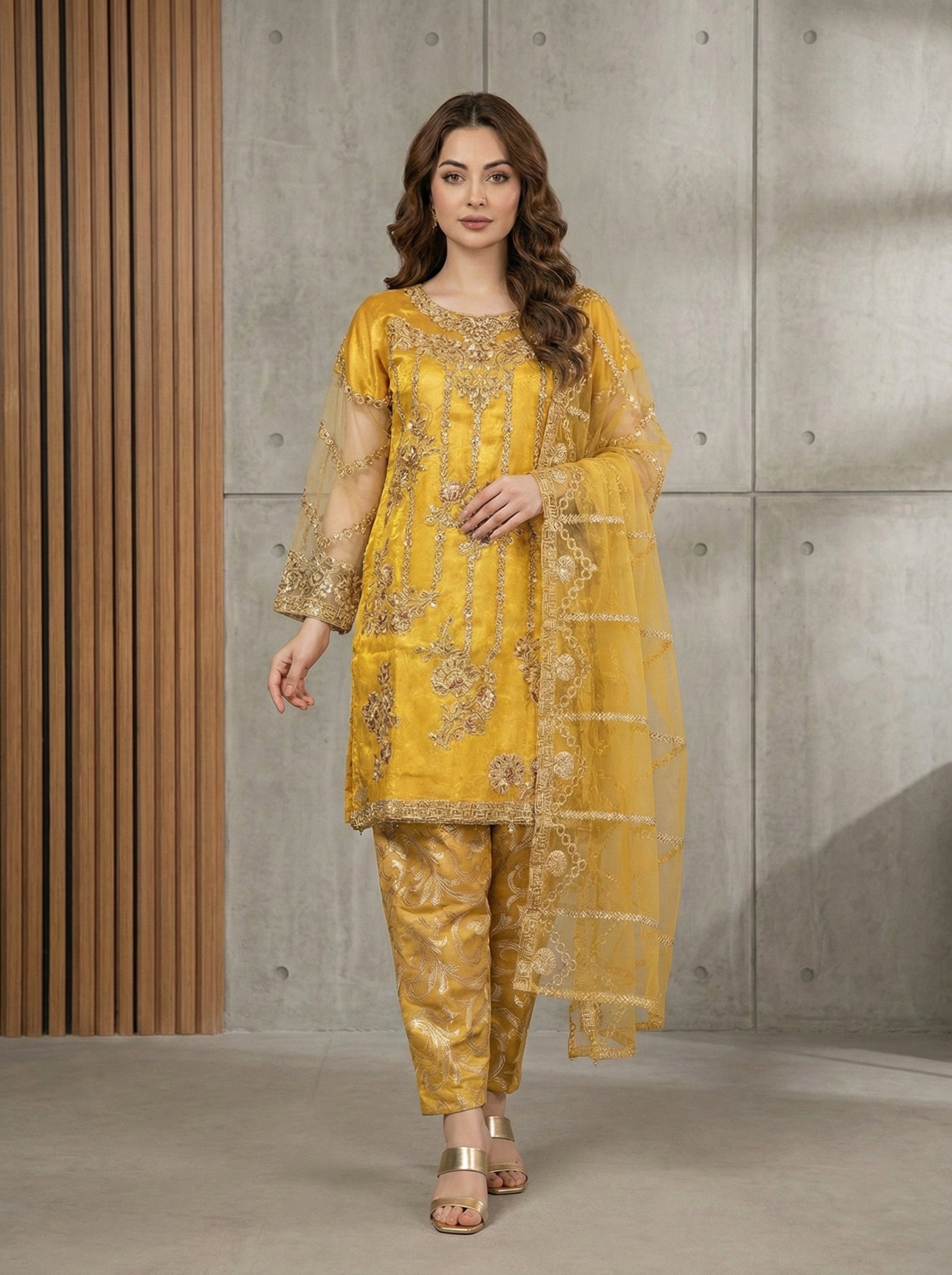 Shirt: Embroidered mustard raw silk shirt with detailed neckline and net sleeves,